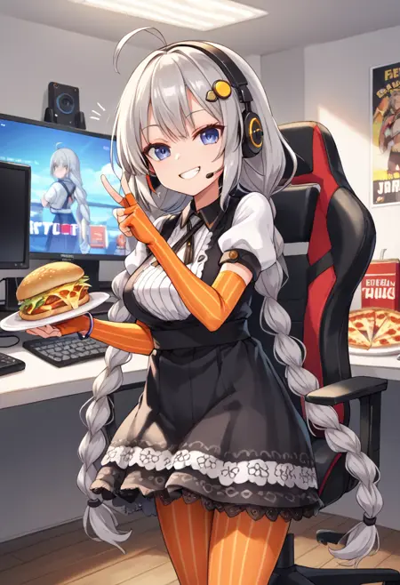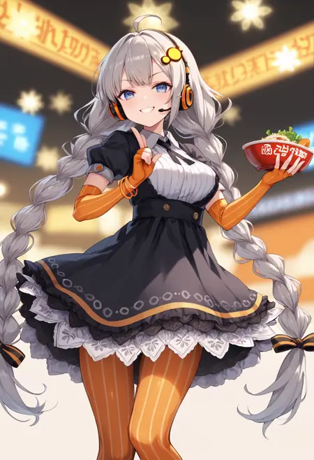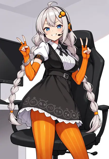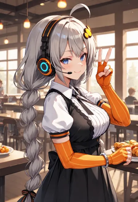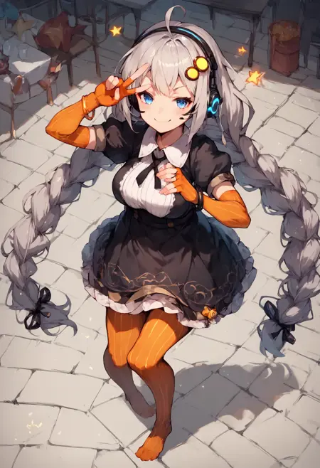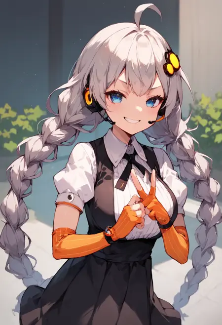 <lora:KizunaAkari_MMD_Pony_V1:0.9>蓝色眼睛,灰色头发,呆毛,双马尾,发辫,超长发,发饰,发管,耳机,头戴式耳机,