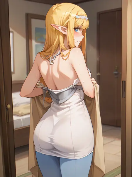 annette,long blonde hair,bangs, blue eyes, elf, pointy ears