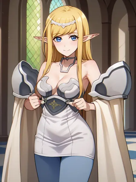 annettedress,armor,bare shoulders, cleavage, collarbone, circlet,hair ornament, jewelry, necklace,white sleeveless dress, fabric,blue legwear