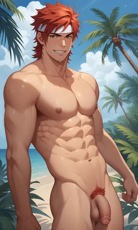 Kovit, red hair, red eyes, headband, abs, pectorals, nipples, navel