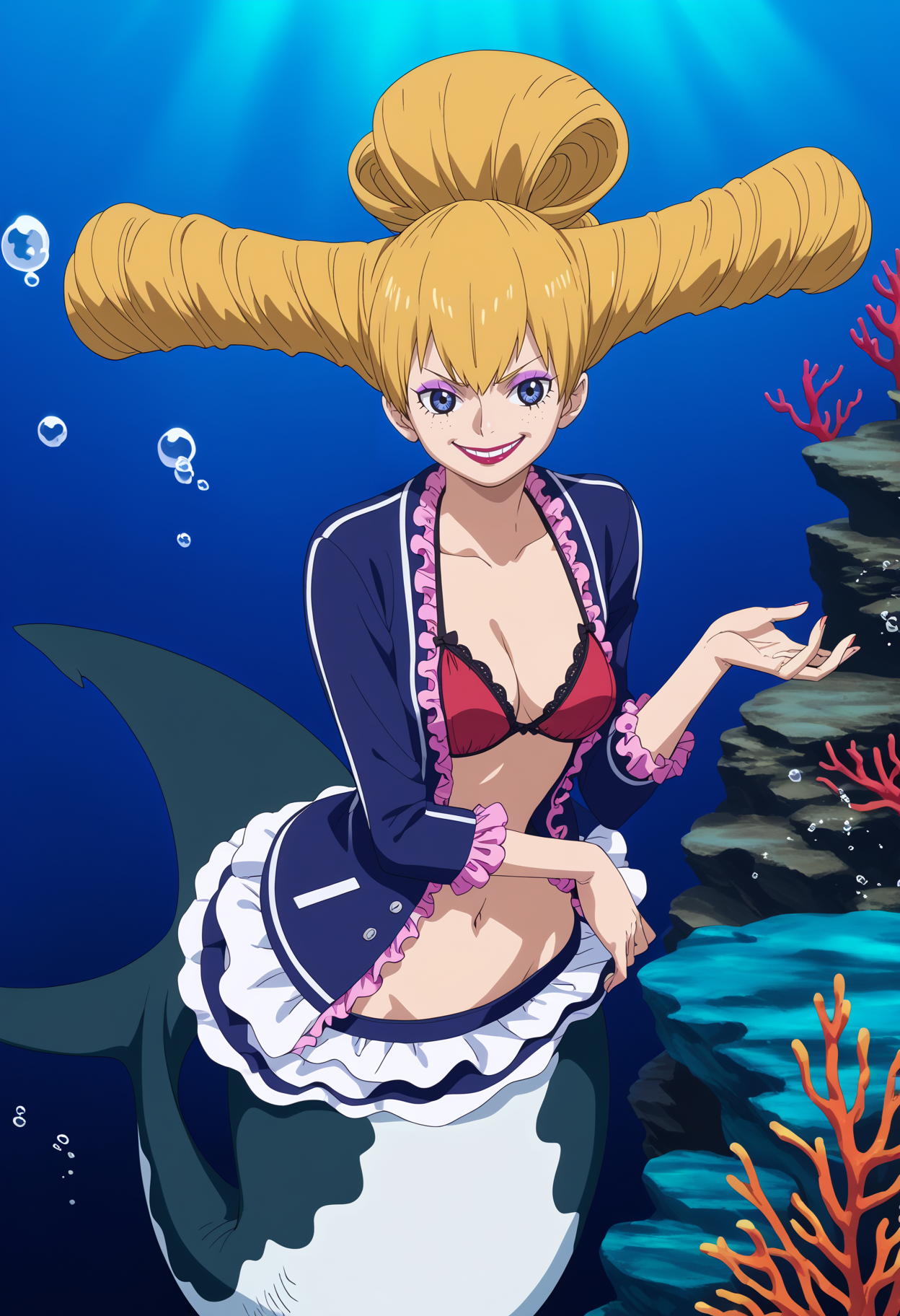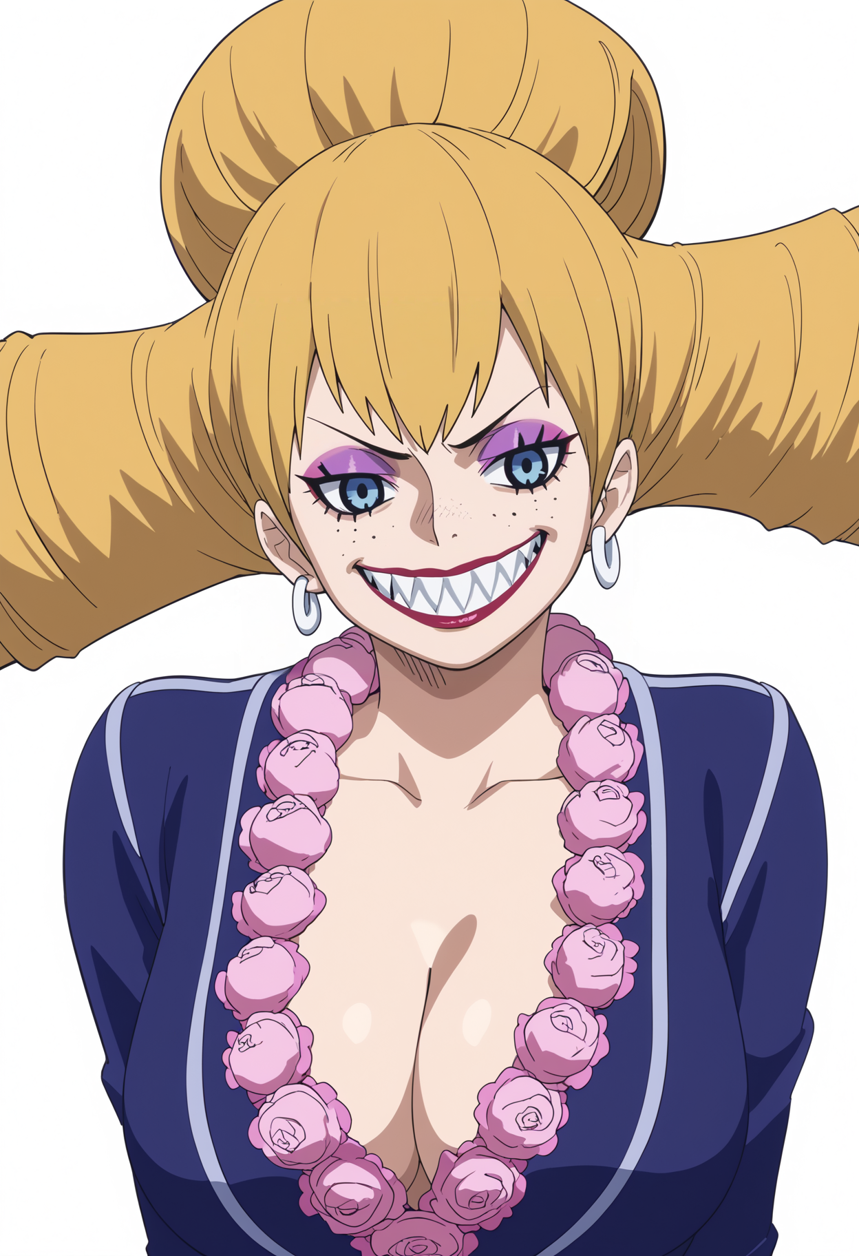 기본 프롬프트: 1girl, charlottepraline, blonde hair, long hair, drill hair, blue eyes, lipstick, makeup, evil grin, sharp teeth