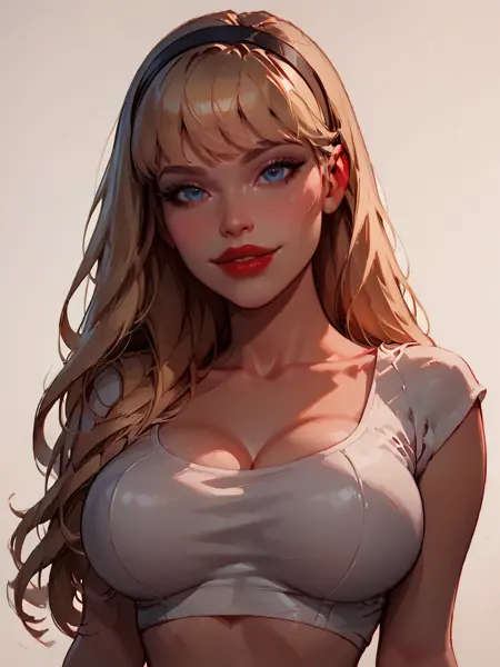 좋은 프롬프트: SuperGirl, 파란 눈, 긴 머리, 검은 머리끈, ((앞머리), 프린지, 미소, 빨간 립스틱,