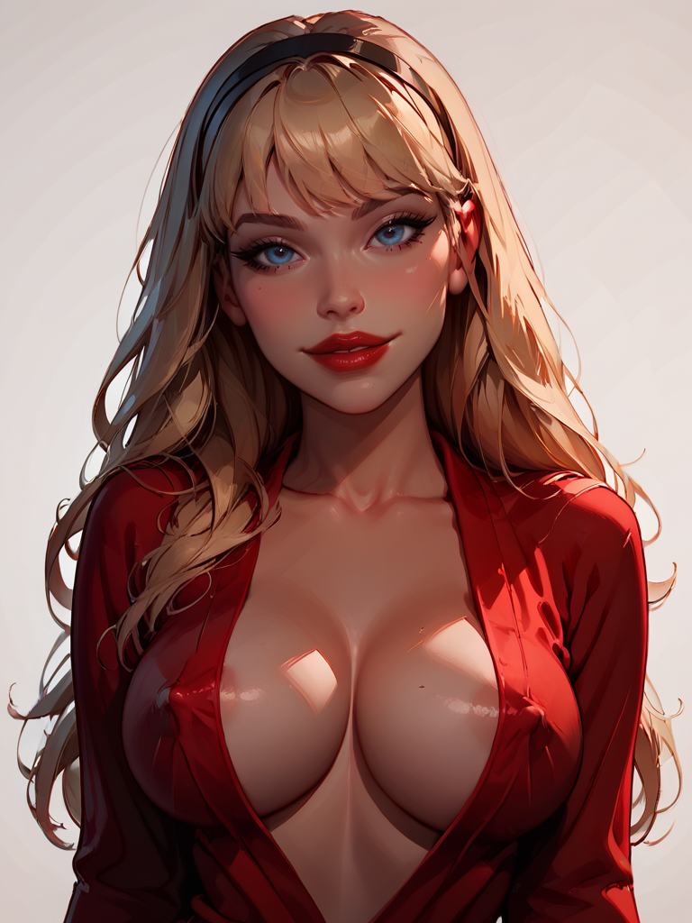 Good Prompts: SuperGirl, blue eyes, long hair, black hairband, ((bangs)), fringe, smile, red lipstick,
