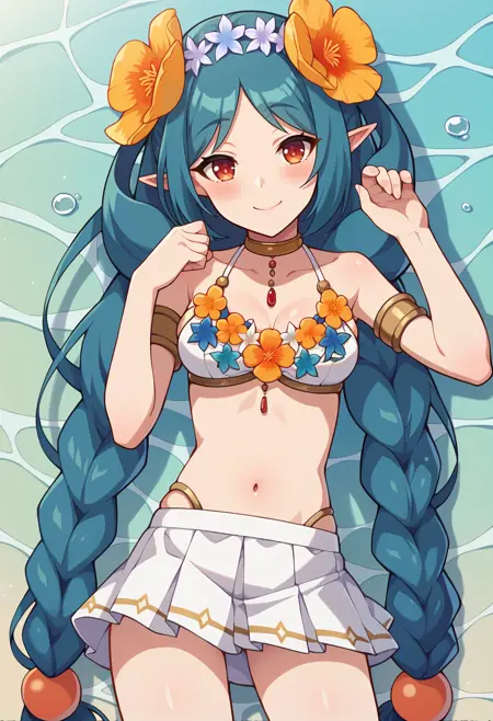 - nebiabase, 트윈 브레이드, 매우 긴 머리, 뾰족한 귀, 파란 머리, 요정, nebswimsuit, 머리 장식, 머리에 꽃, 꽃, 비키니, 황금 목걸이, 팔찌, 흰 치마, 요정 날개, 샌들,
