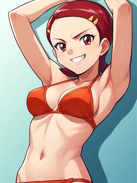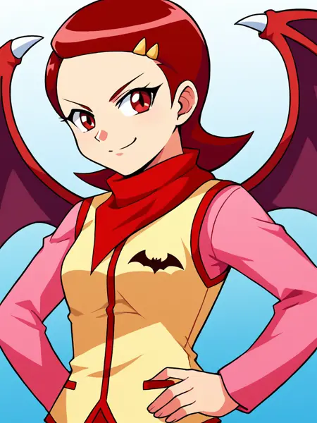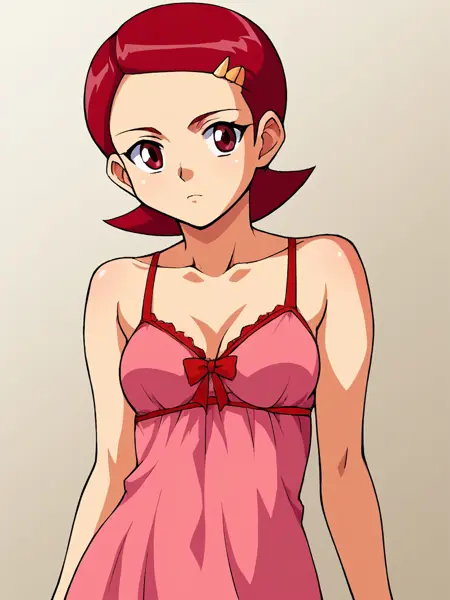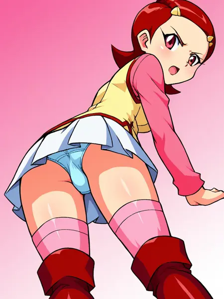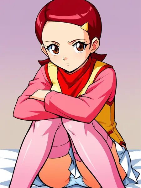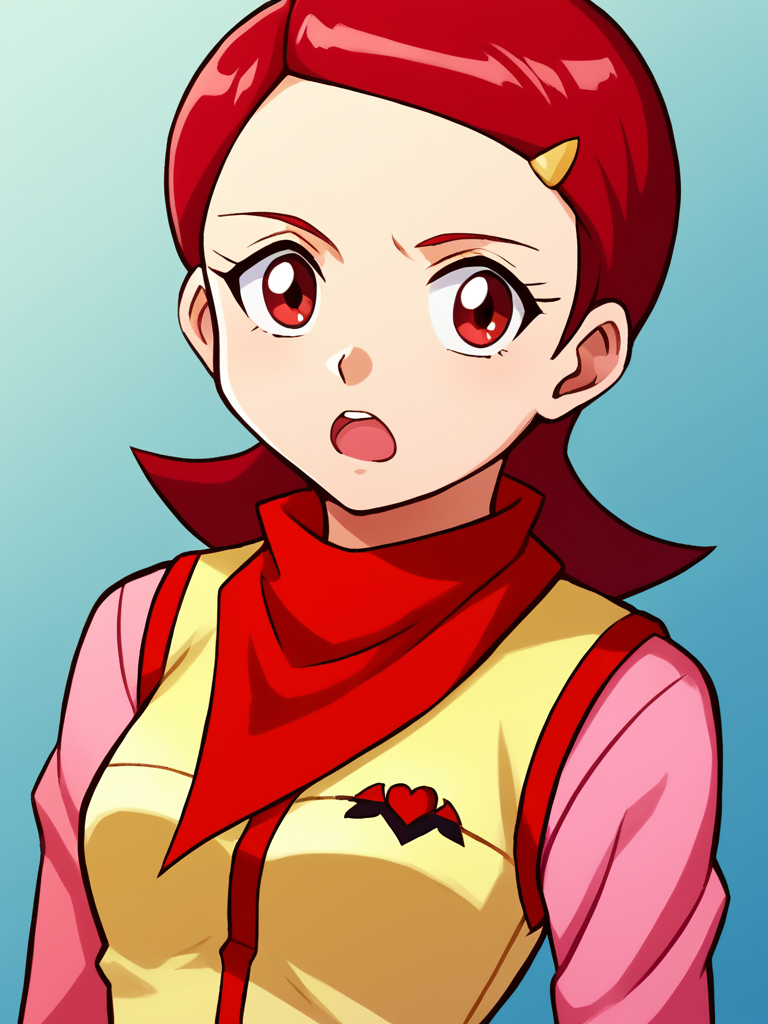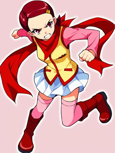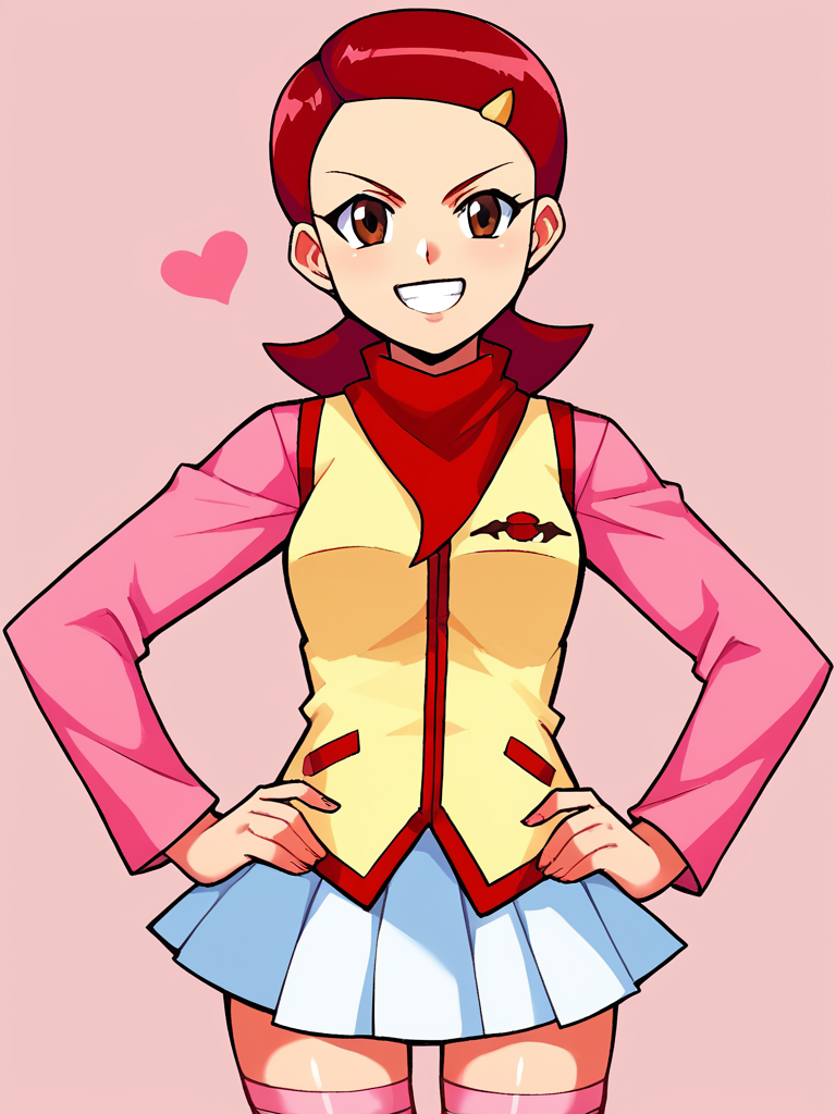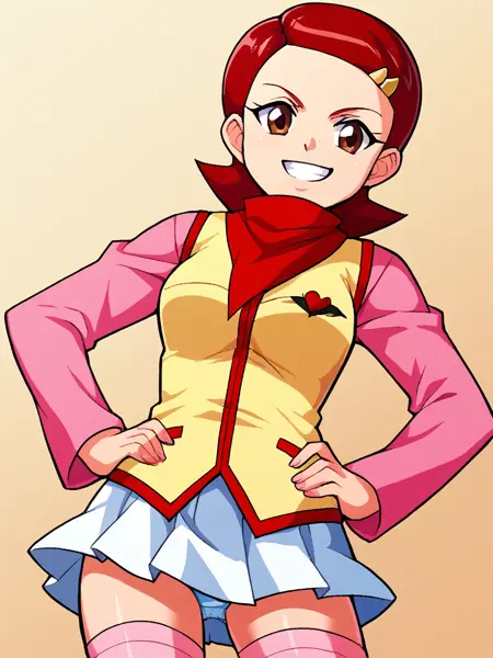 1girl, solo, Kaname_Mirai, short hair, barrette, red hair, brown eyes, red neckerchief, red scarf pink long sleeve shirt, yellow vest with red trim, winged heart emblem, white skirt, pink kneehighs, red boots