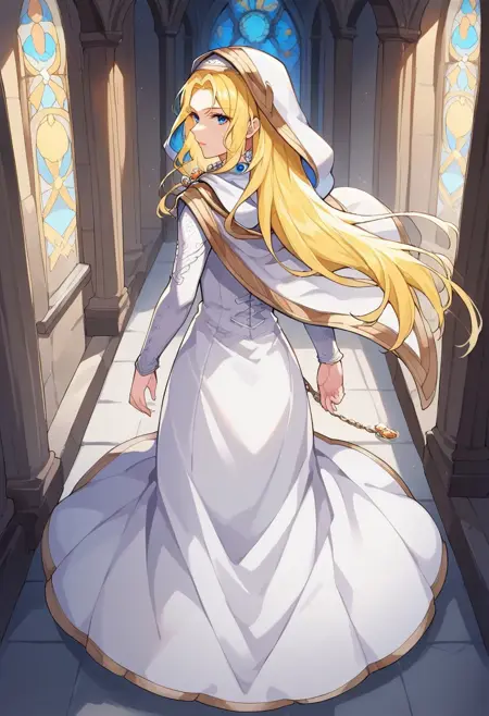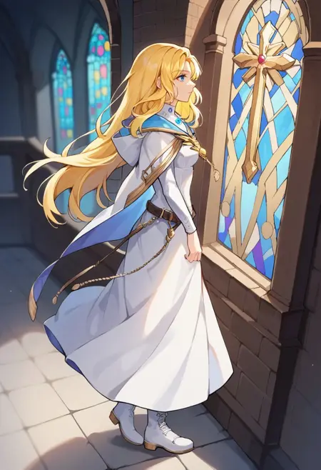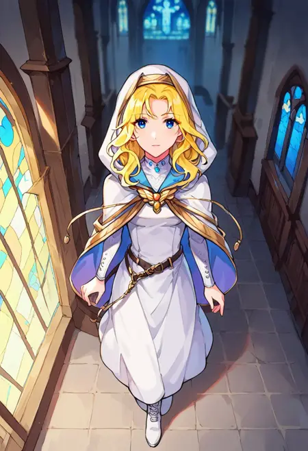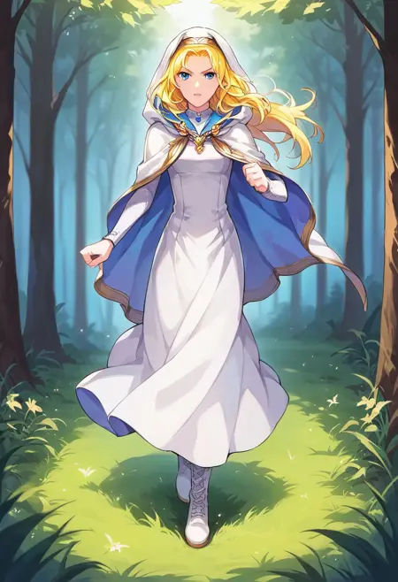 General prompts: NatFEH, blonde hair, long hair, blue eyes, blue gemstone, gold brooch, two-sided fabric, hooded cloak, white hood, hood up, white cloak, blue cloak, rope belt, long sleeves, white dress, long dress, white footwear, white boots,