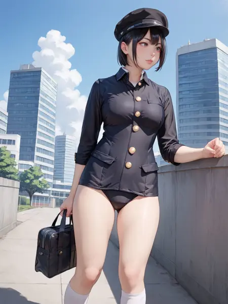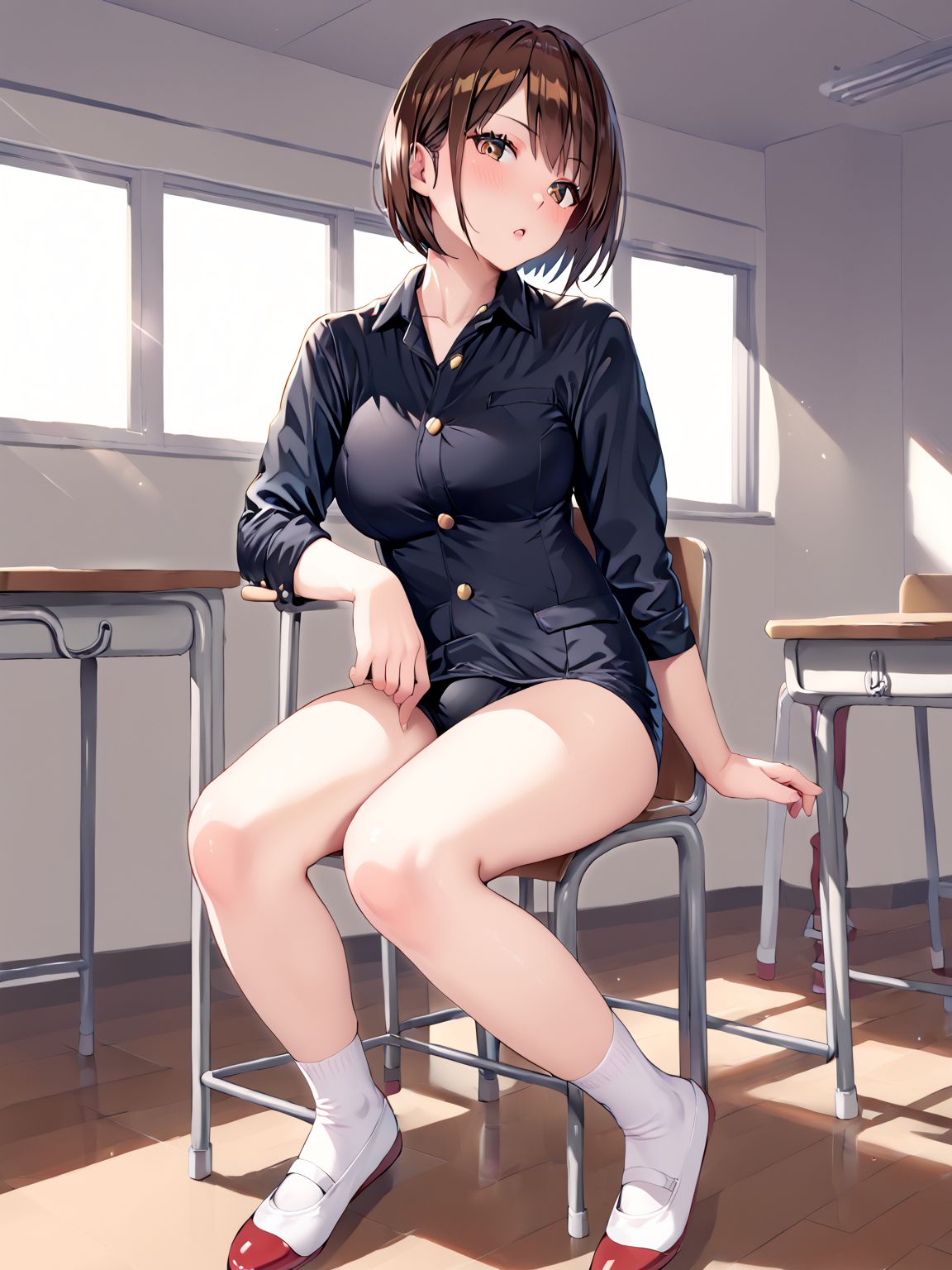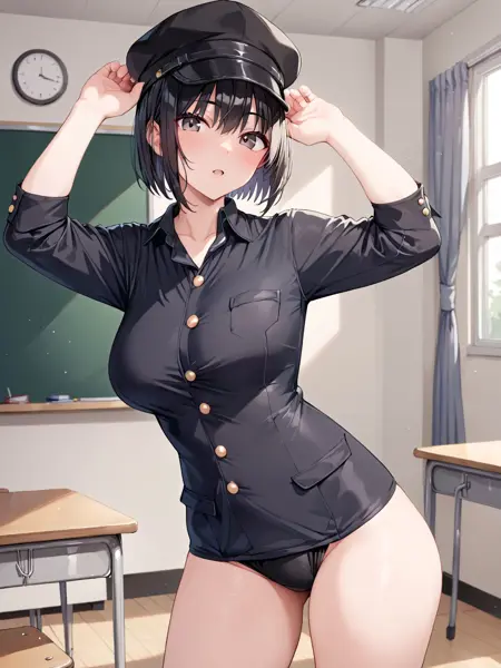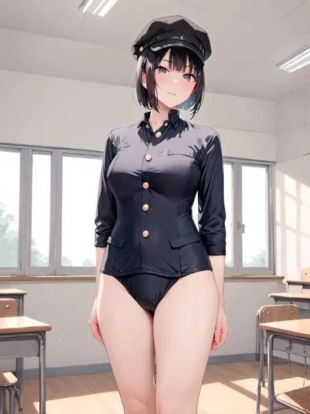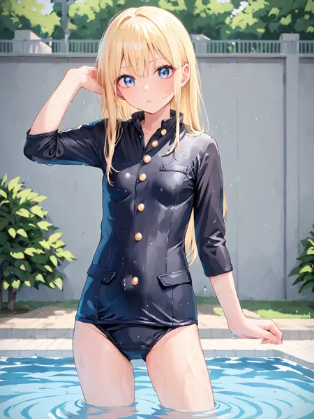 one-piece swimsuit,black one-piece swimsuit,gakuran,school swimsuit,buttons,long sleeves,black sleeves,sleeves rolled up