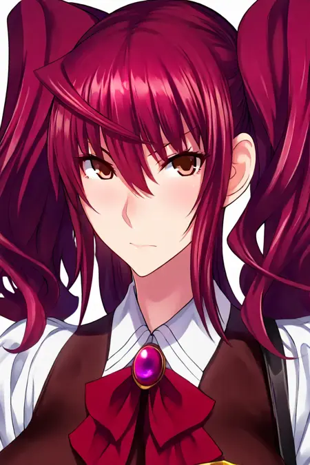 Outfit 2 : erika kuramoto, twintails, red hair, two side up, brown eyes, hair between eyes, perky breast, collared shirt, shirt, ascot, red ascot, juliet sleeves, short sleeves, sweater, covered, brown sweater vest