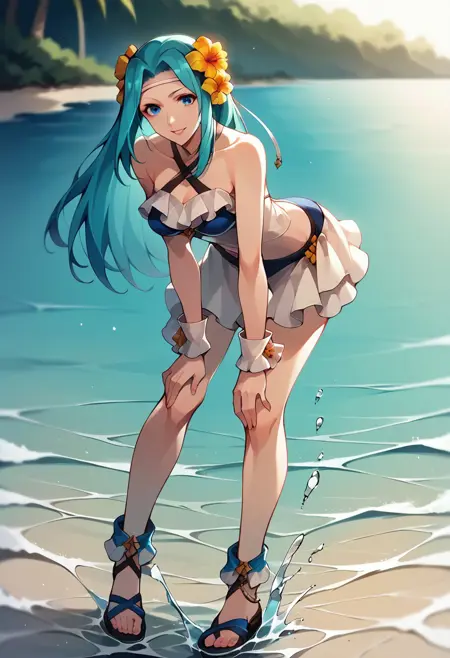 夏用衣装用: SFit、クロスハーラー、ハーラーネック、白いヘアバンド、髪飾り、ヘアオーナメント、水着、多色のビキニ、青いビキニ、白いビキニ、フリル、手首のカフス、足首のカフス、サンダル