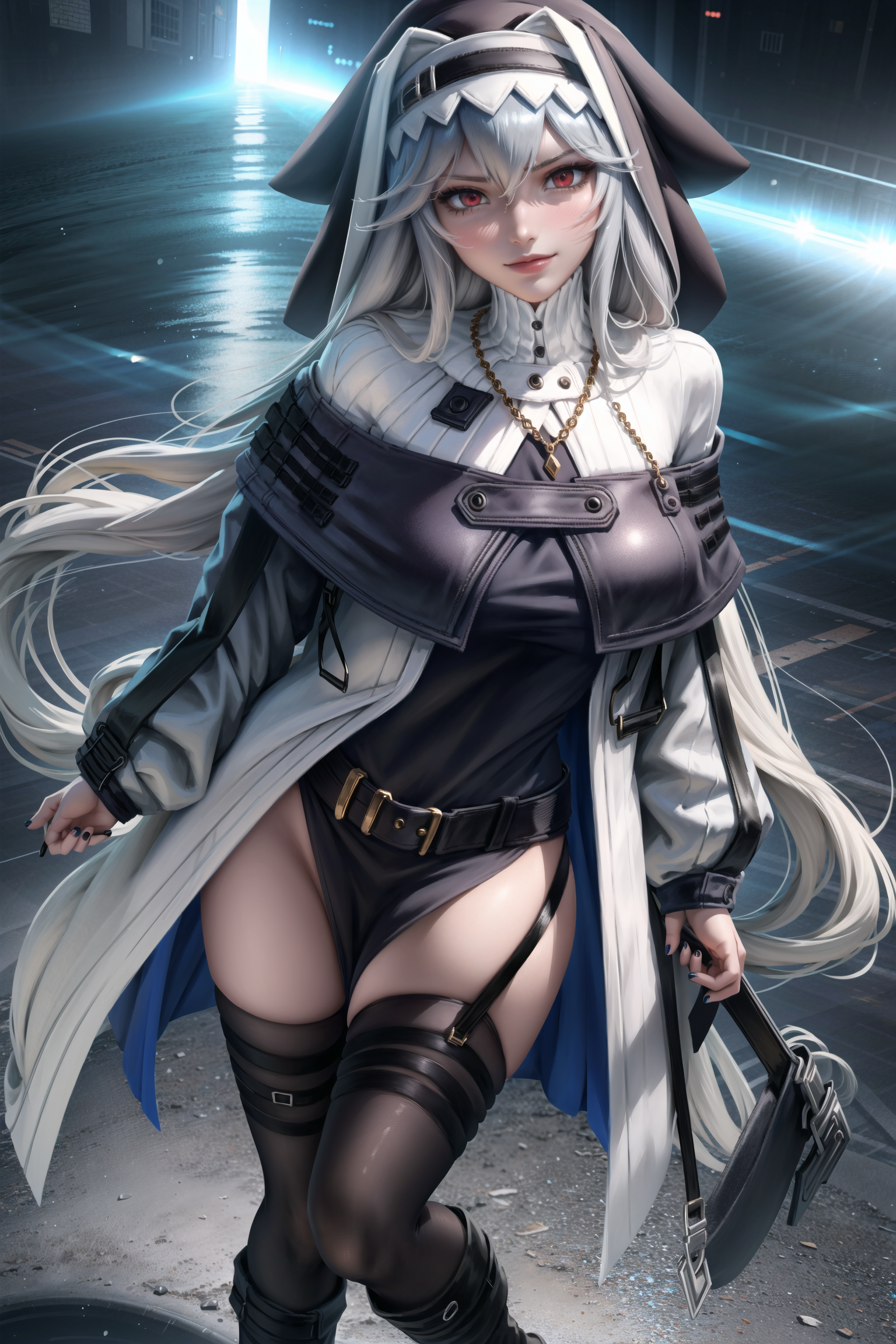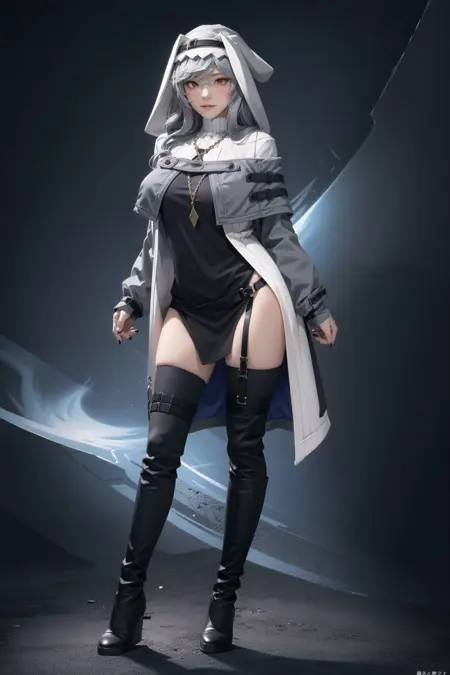提示:幽灵阿卡娜,黑色鞋履,黑色头饰,黑色指甲,黑色长筒袜,兜帽,长靴,小披风,外套,吊袜带,灰色小披风,灰色外套,灰发,头发遮住眼睛,首饰,膝靴,长发,指甲油,项链,露肩,红眼睛,长筒袜