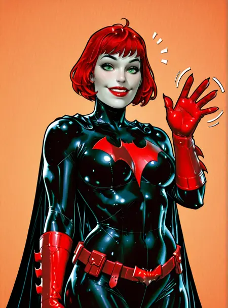 Kate Kane, breasts, pale skin, short hair, red hair, black bodysuit, lipstick, undmasked, green eyes, bat cape, red bat gloves, red boots, red belt