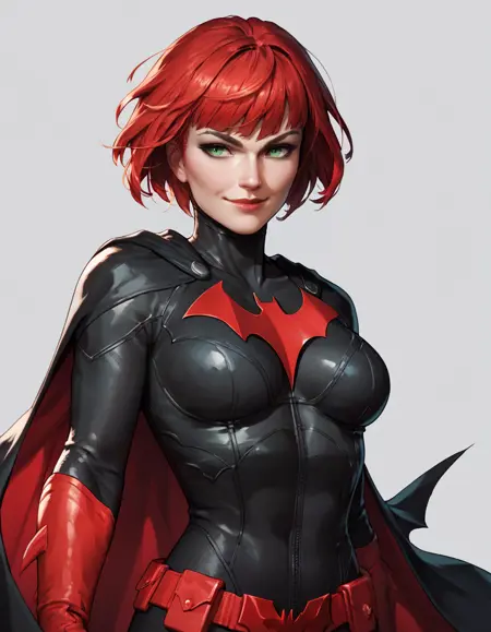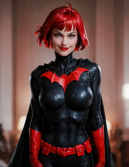 Batwoman, Kate Kane, breasts, pale skin, short hair, red hair, black bodysuit, lipstick, undmasked, green eyes, bat cape, red bat gloves, red boots, red belt