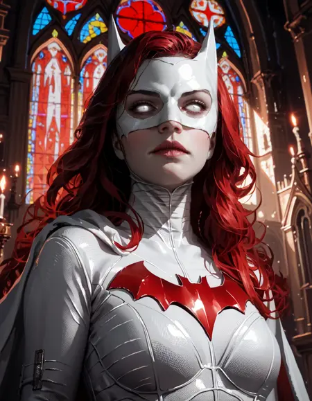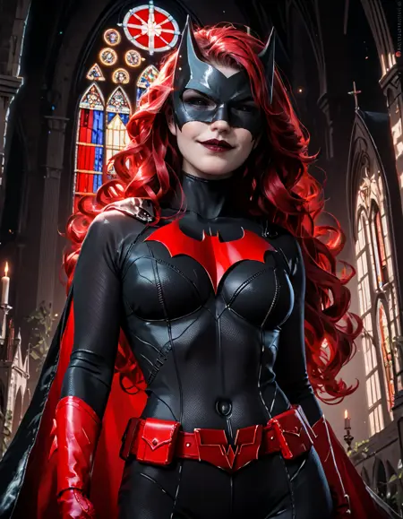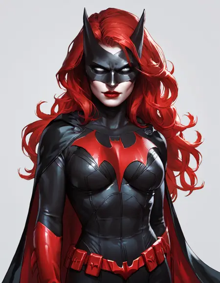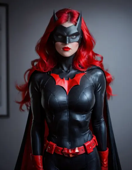 Batwoman, breasts, pale skin, long hair, red hair, black bodysuit, lipstick, mask, white sclera, bat cape, red bat gloves, red boots, red belt