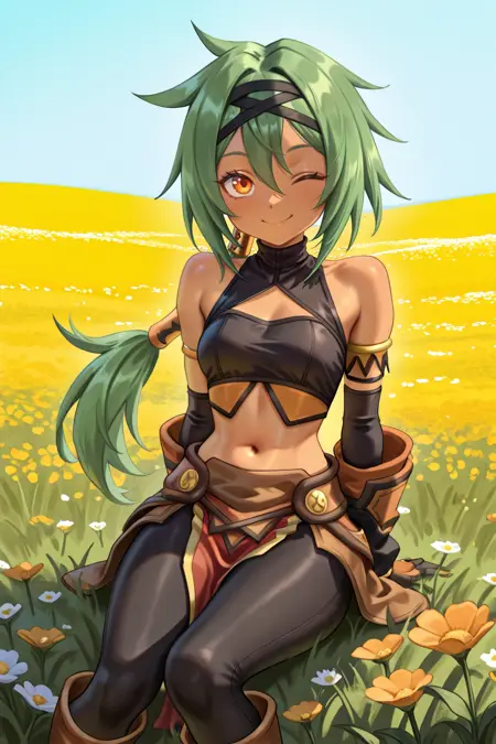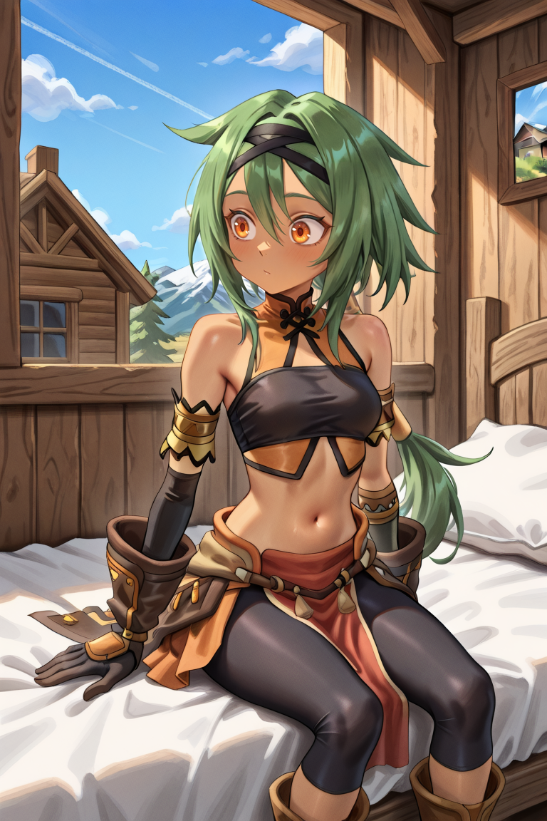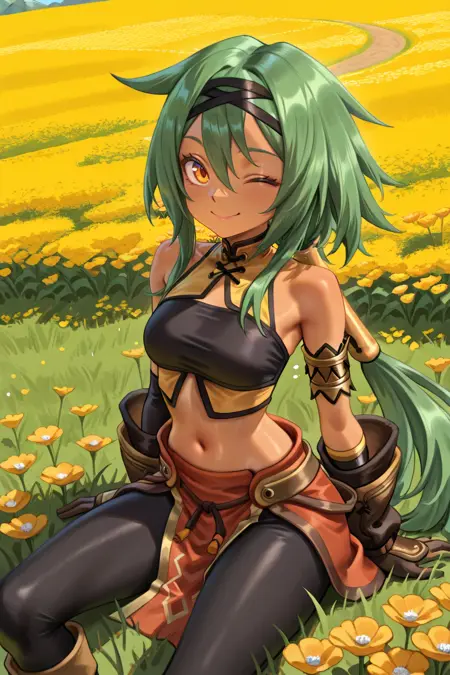 유용한 태그: 1girl, 검은 피부, 초록색 머리카락, 낮게 묶인 긴 머리, 긴 머리, 주황색 눈, 어깨 노출, 검은 튜브탑, 팔 보호대, 검은 팔 보호대, 허리 부분, 스커트, 갈색 스커트, 골반 커튼, 빨간 골반 커튼, ((터틀넥 셔츠)), 소매 없는 터틀넥, 팔찌, 검은 레깅스, 장갑, 부츠
