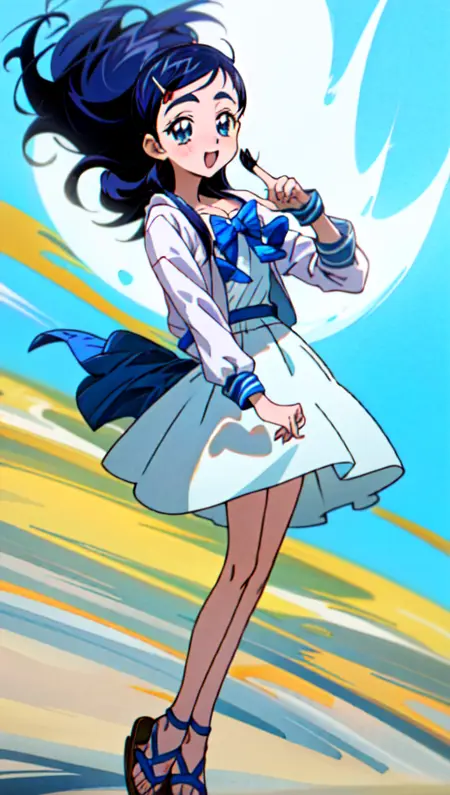 (masterpiece), best quality, (cel anime), highest quality, ((high detail:1.2)), (HDR), (cinematic light:1.1), highres, (fingers 5 fingers), (ultimate cute girl), highres, 1girl, solo, (little girl:1.5), (full body), dress, blue hair, hair ornament, skirt, sandals, hairclip, (white dress:1.5), (long skirt:1.5), blouse, long sleeves, white blouse, (white jacket:1.2), sandals, blue sky, park, lora:honoka\_yukishiro\_v1:0.8, (yukishiro honoka), (honokacos1:1.5), smile, (model pose)