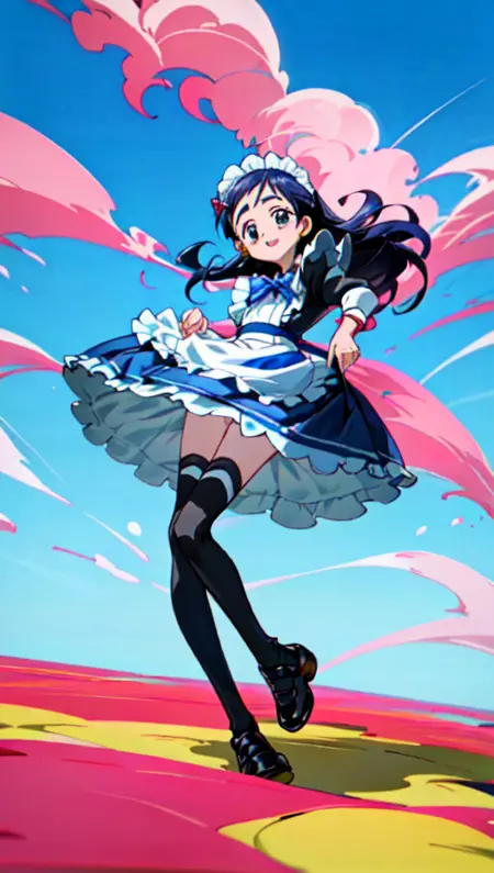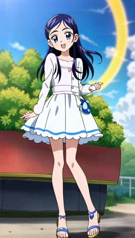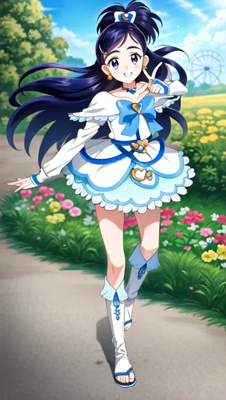 (masterpiece), best quality, (cel anime), highest quality, ((high detail:1.2)), (HDR), (cinematic light:1.1), highres, (5 fingers:1.2), (ultimate cute girl), highres, 1girl, solo, (curewhite:1.5), (little girl:1.5), (full body), half updo, blue sky, park, lora:honoka\_yukishiro\_v1:0.8, jewelry, white footwear, earrings, dress, boots, white dress, heart, brooch, magical girl, knee boots, heart brooch, frills, ribbon, bow, black hair, leg warmers, arm warmers, blue hair, heart earrings, black eyes, gloves, hair ornament, smile, (model pose)
