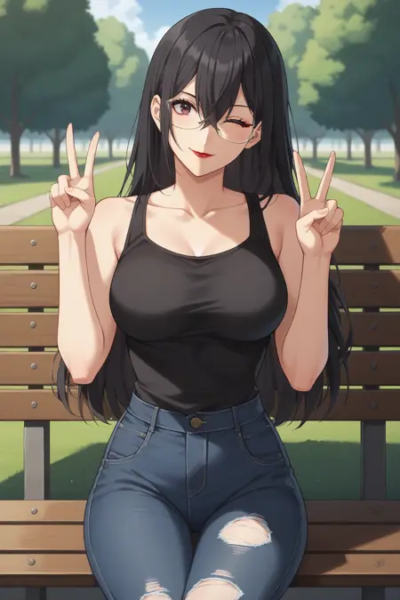 KJOmayuri, black hair, dark eyes, long hair, hair between eyes, glasses, red lips,