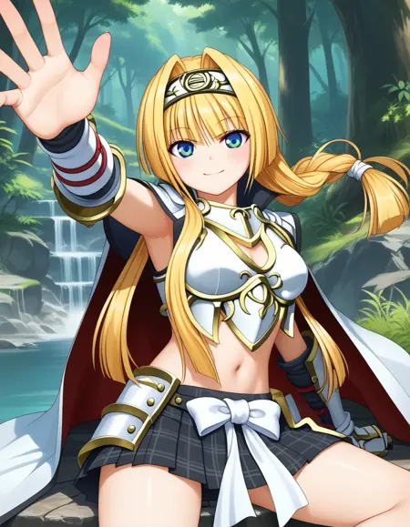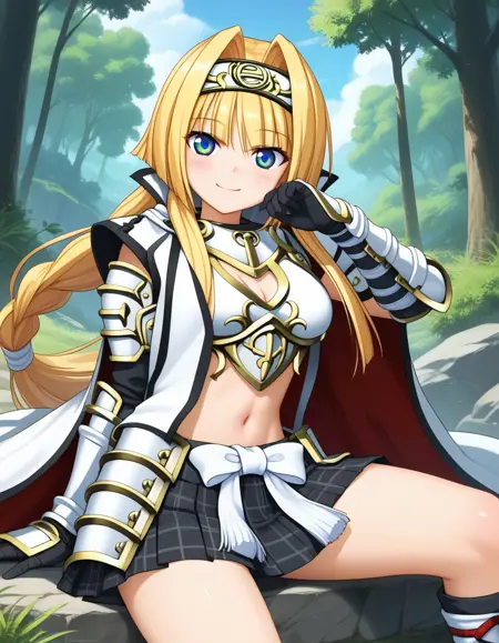 armor, midriff, black skirt, pleated skirt, skirt in plaid skirt,navel, hairband, cape, white bow, gauntlets,