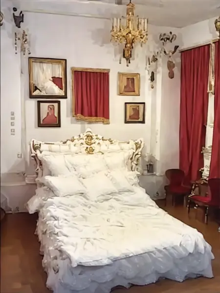 indoors,bedroom,bed,red curtains,picture frame,white wall,chandelier,white bed sheet