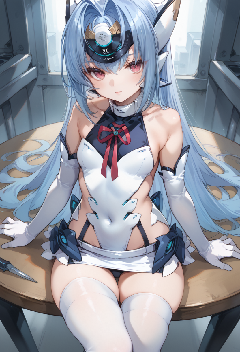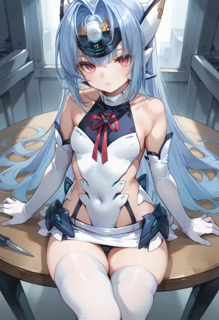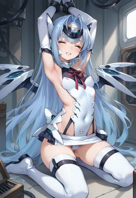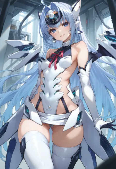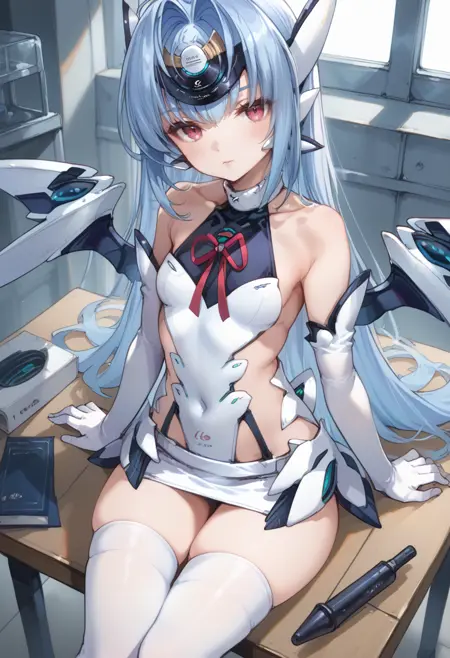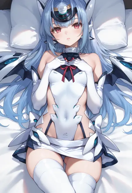 标签(服装):白色额护具、白色肘部手套、白色高腿紧身衣、机器人、白色大腿长靴、白色迷你裙