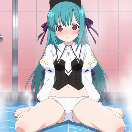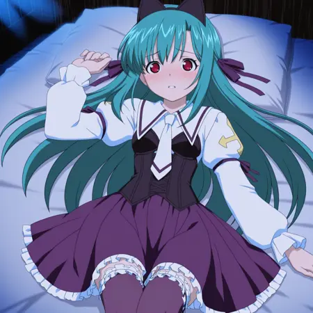 ブラックロリ, hayamakotono, アクアヘア, 長髪, 赤い目, 小さな胸, 白いシャツ, 白いセーラーカラー, 紫のスカート, 白いスカート, フリル付きスカート, ミニスカート, 膝丈ブーツ, 黒い靴, 紫のハイソックス, フリル付きハイソックス, 黒いコルセット, 髪リボン, 紫のリボン, 髪飾り