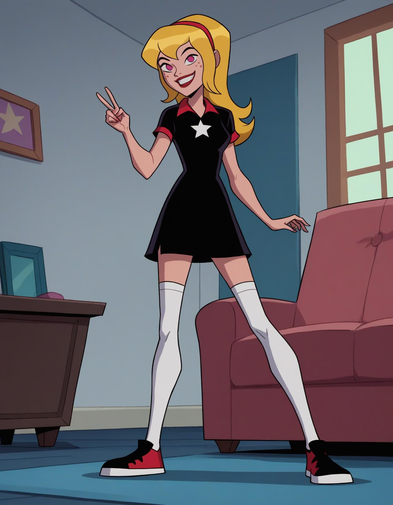 hairband, collared dress, black dress, white thighhighs, sneakers