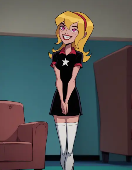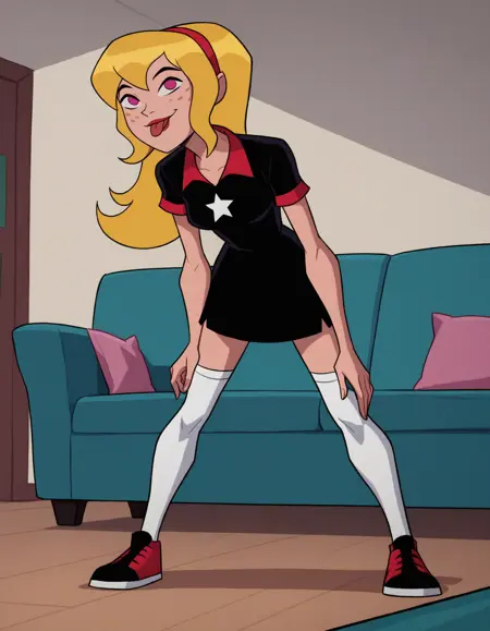 xlucyx, blonde hair, long hair, pink eyes, freckles, red lips