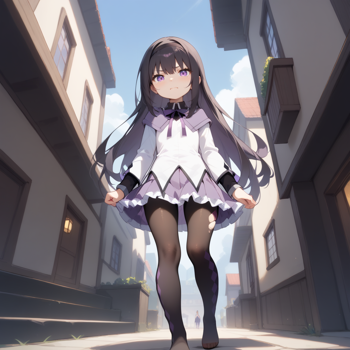 (아케미 호무라, 긴 머리, 검은 머리, 검은 머리띠, 앞머리, 보라색 눈), (마법소녀, 목에 띠, 긴 소매, 셔츠, 흰 셔츠, 리본, 치마, 주름치마, 보라색 치마, 프릴 치마, 프릴, 미니 치마), (검은 팬티스타킹, 팬티스타킹, 암블 무늬 다리용 신발, 한쪽만 암블 무늬), 찢어진 팬티스타킹,