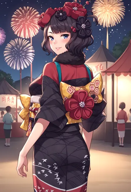 katsushika_excone, black hair, blue eyes, hair ornament, short hair, hairpin, hair flower, black kimono, fur collar,