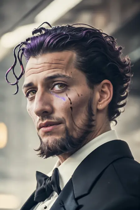 为提高一致性:紫色头发,眼袋,面部标记,男性主体,1boy
