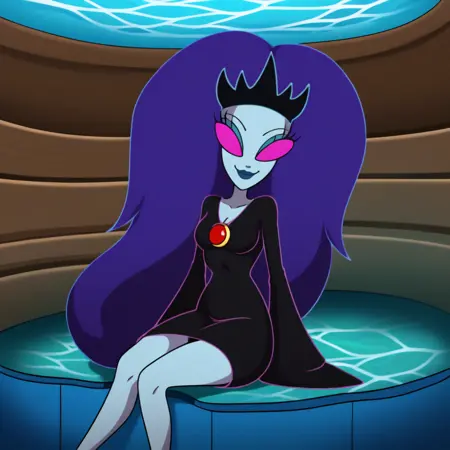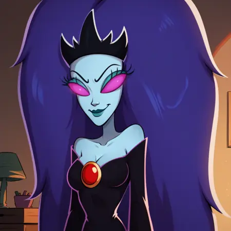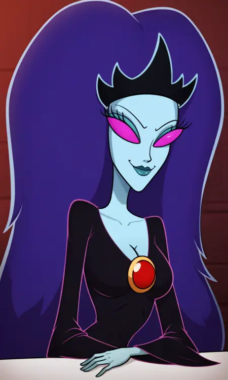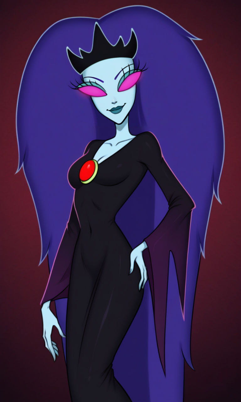| トレーニングワード | score_5_up, score_4_up, blue skin, colored skin, pink eyes, solid eyes, no pupils, tight dress, black dress, long sleeves, dark purple hair, very long hair, big hair, black crown, long eyelashes, red broach, lips, hourglass figure, cleavage, cartoonコピーしました! |