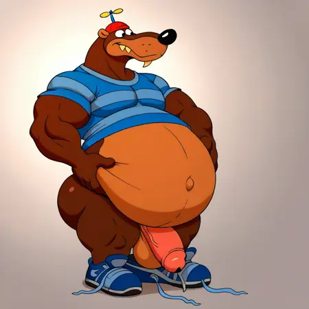Stupid_pdxl, 퓨리, 족제비, 갈색 피부, 밝은 갈색 카운터 색조, 검은 코, 흰자위, 검은 눈, 파란색과 회색 줄무늬 티셔츠, 프로펠러 달린 빨간 빈니, 프로펠러 모자, 뚱뚱함, 풀린 끈을 단 신발, 더러운 파란색 신발에 풀린 끈