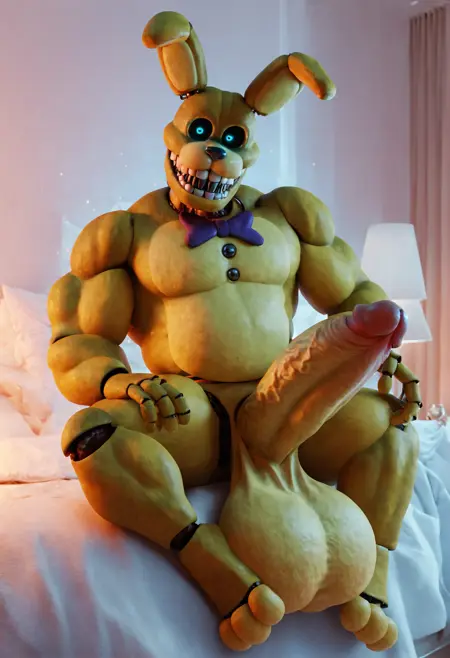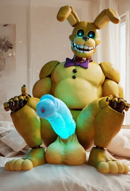 pitbonnie, animatronic, yellow fur, blue eyes, black sclera, black buttons