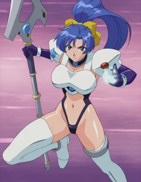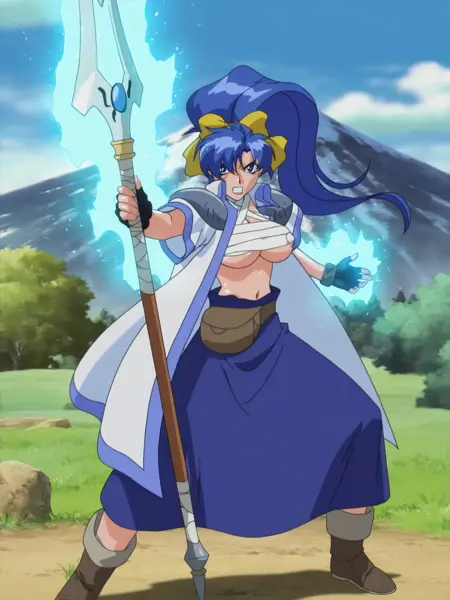 胸部缠布, 开襟长袍, 无指手套, 腰带口袋, 长裙, 蓝色裙子, 曲线玲珑, 大乳房, 露腹, 肚脐, 手持长矛, 黄色鞋履, 靴子