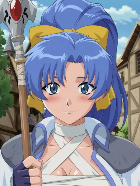 蓝色头发, 高马尾, 发带, 蓝色眼睛, 嘴下有痣,