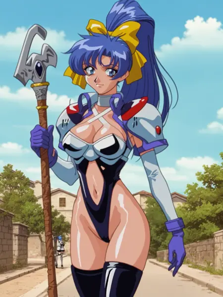 胸部缠布, 开襟长袍, 无指手套, 腰带口袋, 长裙, 蓝色裙子, 曲线玲珑, 大乳房, 露腹, 肚脐, 手持长矛, 黄色鞋履, 靴子