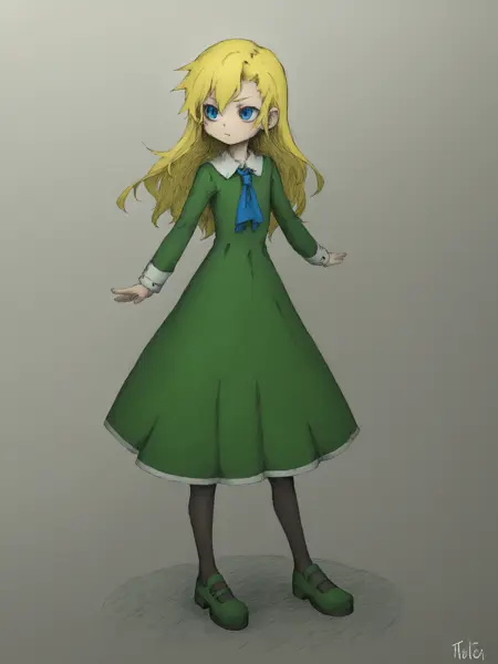 1girl, mary (ib), solo, long hair, flat_chest, blue eyes, blonde hair, long sleeves, dress, pantyhose, shoes, green dress,