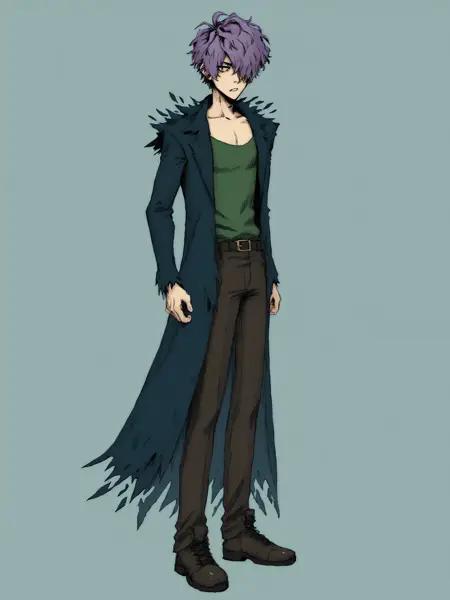 1boy, garry (ib), solo, purple hair, short hair, hair over one eye, green shirt, shoes, pants, belt, coat, brown pants,