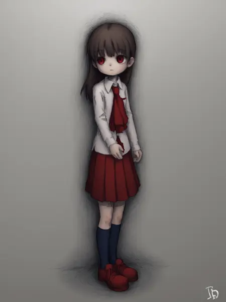 1girl, ib (ib), solo, flat_chest, expressionless, bangs, long hair, brown hair, red eyes, shirt, skirt, long sleeves, white shirt, pleated skirt, shoes, collared shirt, socks, ascot, kneehighs, red skirt, black socks, red footwear, red ascot, blue socks,