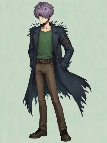 1boy, garry (ib), solo, purple hair, short hair, hair over one eye, green shirt, shoes, pants, belt, coat, brown pants,