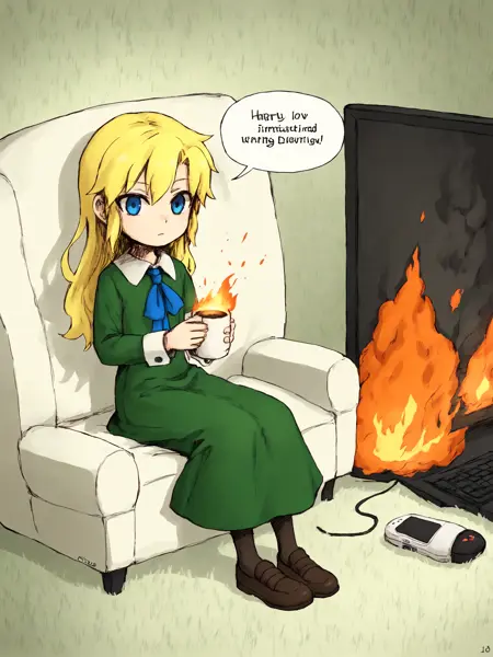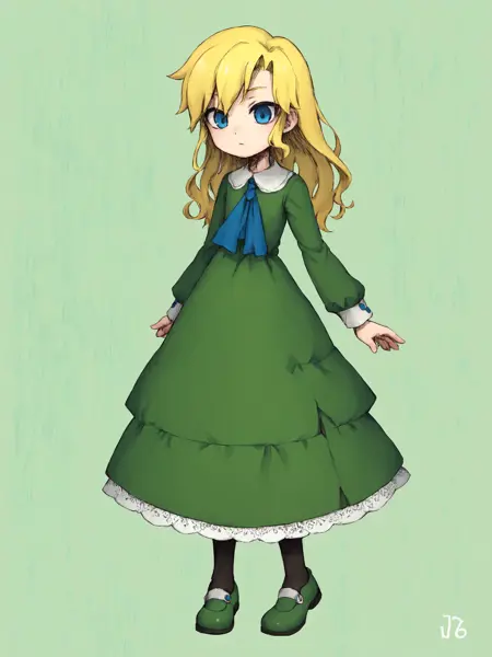 1girl, mary (ib), solo, long hair, flat_chest, blue eyes, blonde hair, long sleeves, dress, pantyhose, shoes, green dress,