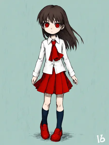 1girl, ib (ib), solo, flat_chest, expressionless, bangs, long hair, brown hair, red eyes, shirt, skirt, long sleeves, white shirt, pleated skirt, shoes, collared shirt, socks, ascot, kneehighs, red skirt, black socks, red footwear, red ascot, blue socks,