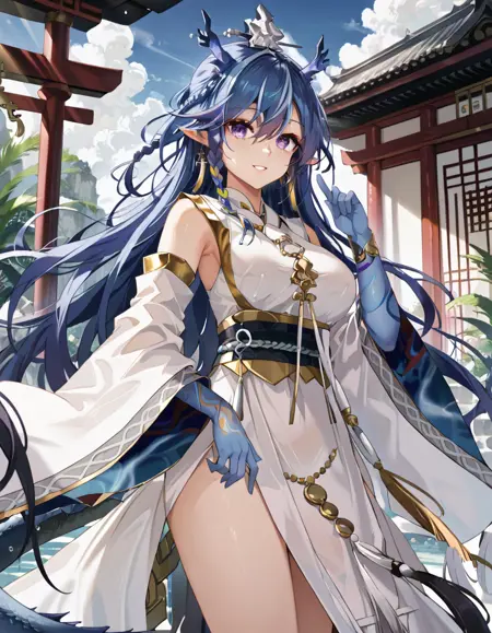 Ling, very long hair, streaked hair, blue hair, purple eyes, Ling dragon horns, Ling dragon tail, large breast,colored skin,braid