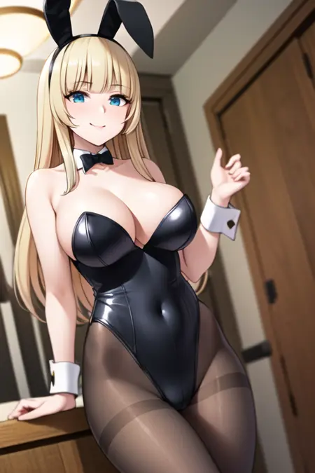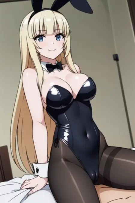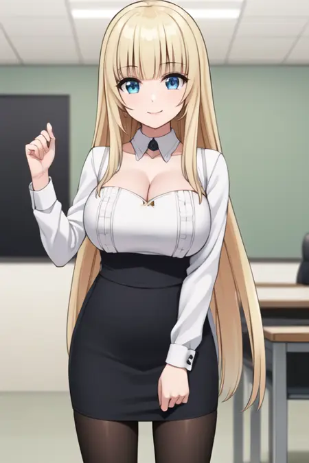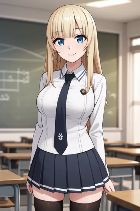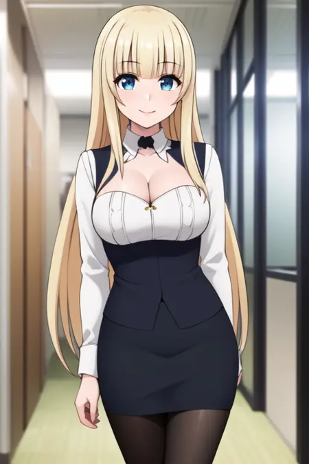 maria fianna albert, maria, ore dake haireru, bangs, blonde_hair, blue_eyes, breasts, long_hair, cowboy_shot, dress, armor, skirt, thighhighs, white_dress, white_gloves, black_legwear