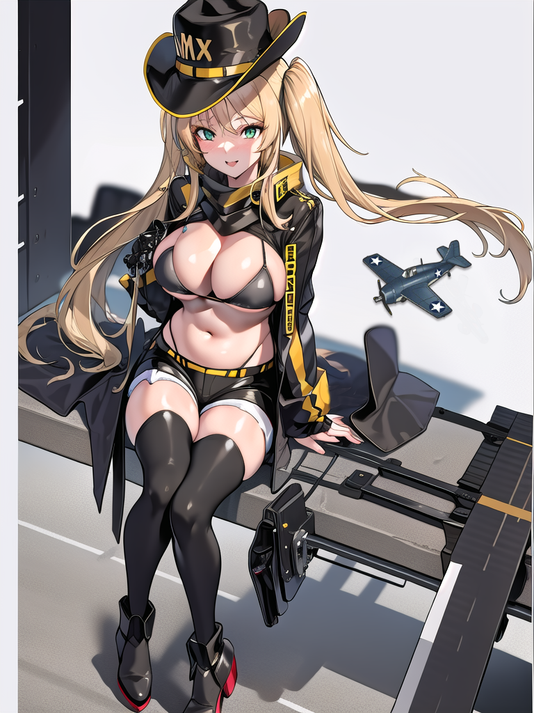 1)帆索装: Hornet, 1girl, 穿透式胸部, 黑色比基尼上衣, Hor_outfit, 黑色手套, 黑色迷你短裤, 翠绿色眼睛, 金色双马尾发型, 高筒袜, 手持帽子, HRR_hat, 飞行队, 黑色披风, 背负帆索机械装置