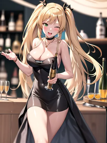 5)活力周年庆!>>> Hornet, 1girl, 金色头发, 双马尾发型, 挑眉眨眼, 翠绿色眼睛, 张开嘴巴, 微笑, 穿着 BUA_dress, 乳沟显露, 黑色迷你裙, 手持香槟瓶, 背景中有香槟瓶陈列