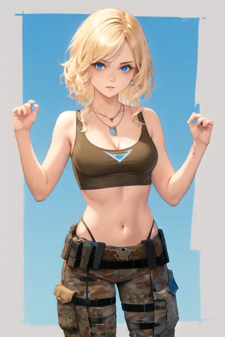 TanyaAdams, 1girl, solo, blue eyes, blonde hair, navel, cleavage, jewelry, medium breasts, midriff, belt, pants, necklace, crop top, brown tank top, camouflage pants