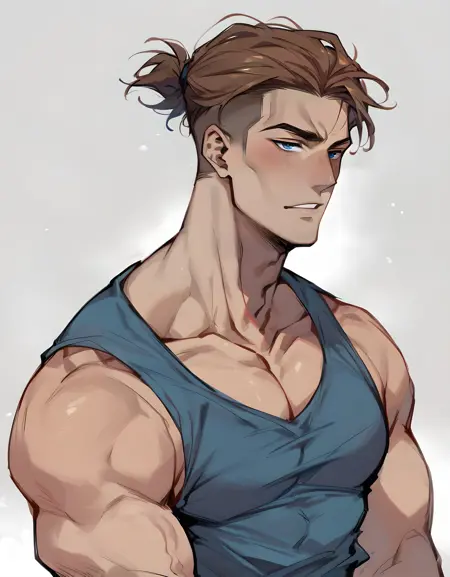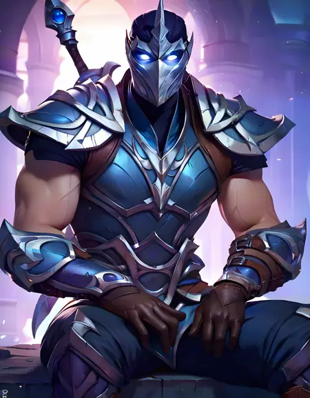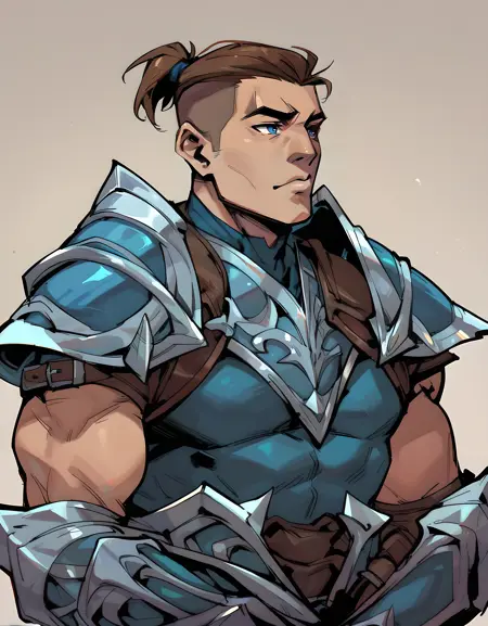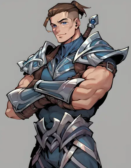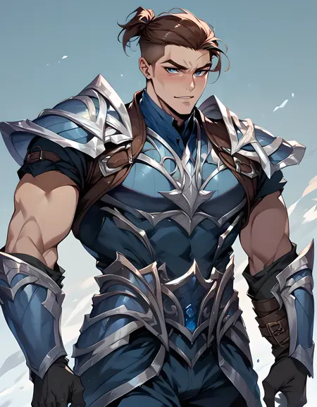 腕当て、手袋、アーマー、肩アーマー、ガントレット、青いズボン、背中に武器
