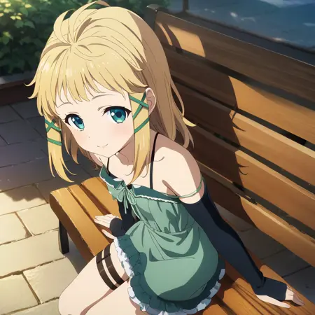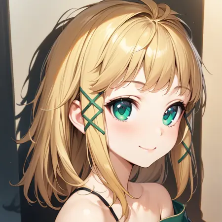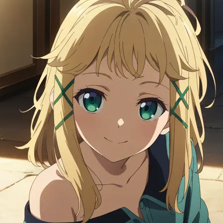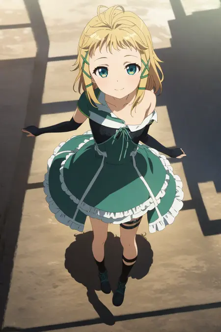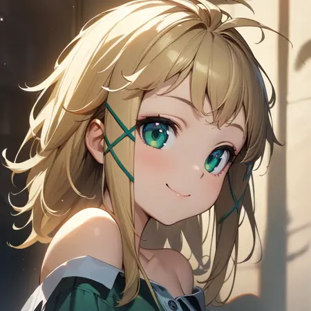 激活标签为 "tina_sprout",外观标签为 "绿色眼睛、金色头发、凌乱头发",基础服装标签为 "十字形发饰、平胸、绿色连衣裙、露肩、大腿绑带、肘部手套", alternatively,也可以使用 "动漫上色" 标签,这会略微改变模型上色的风格。