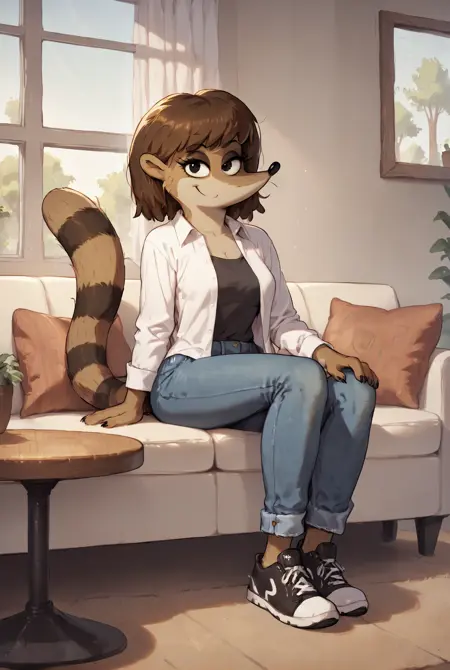 1girl, furry female, b4rber4, racoon, tail, solo,